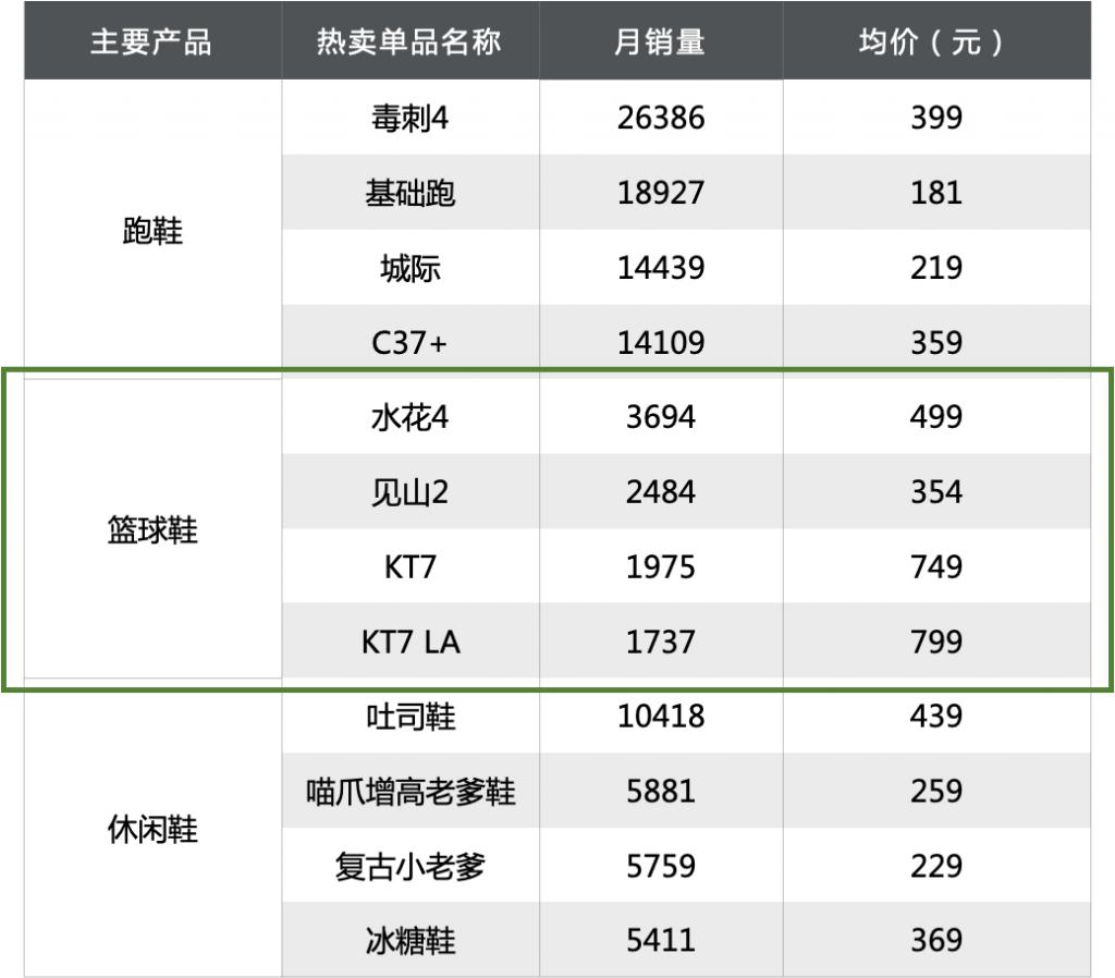 不过,最近几年安踏品牌的篮球业务表现不佳。海通国际在近期的研报中提到安踏品牌几个运动鞋品类的占比:跑鞋、篮球、综训、其他鞋类的比重分别是 40%、中低双位数、中双位数、30%,能够看出篮球份额之低。国海证券按照跑鞋、篮球鞋、休闲鞋分类,对安踏此前的各鞋类品类进行了月销量统计,篮球鞋同样最低。徐阳上任后不止一次提到,安踏品牌的篮球曾是明星系列,过去几年因为变化少而落后了。