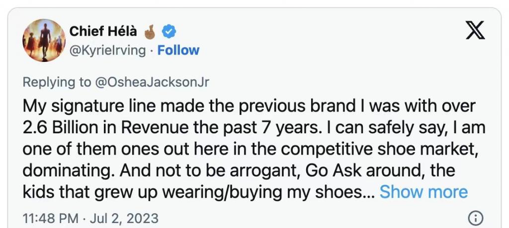 欧文自己也对其影响力有充分自信,2025 年 7 月他发文称 " 在过去 7 年里,我的标志性系列创造了超过 26 亿美元的收入,我可以有把握地说,我是竞争激烈的鞋类市场中的主导者之一。" 此外,在她与耐克解约之前,整个 NBA 联盟中穿着欧文 7 代战靴的球员高达 164 位,欧文的球鞋近年来在耐克的表现也仅次于勒布朗•詹姆斯。