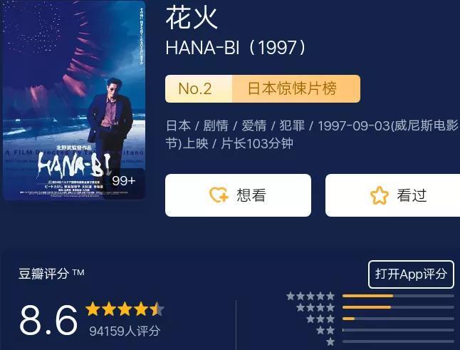 片名《花火》,一个是花,一个是火。影片中老西与老婆的爱情,一方面像花一样的美丽、温馨;另一方面又像火一样的炙热、激烈。