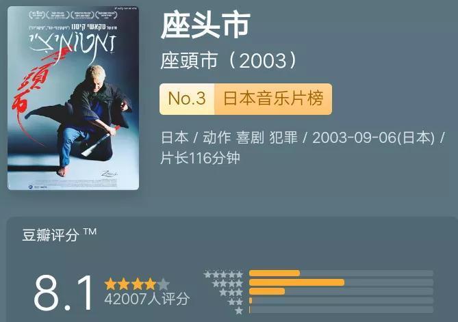 《座头市》2003.09.06上映,该片展现了那种经典老片的亲切感,完全不比老版逊色。
