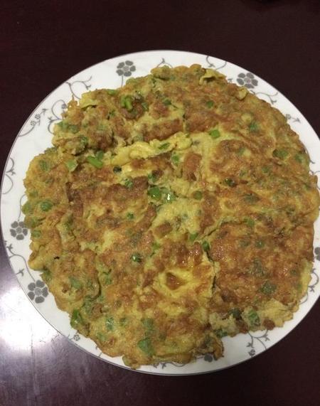 大勺烧热加入适量的油,油温六成左右,倒入搅匀的蛋液,晃动大勺,防止糊底,煎制完全要凝固时,顺手牵羊大翻勺。煎到两面金黄,托出装盘。