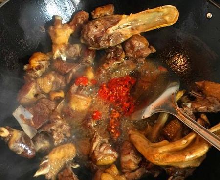 6、在锅中加入适量的菜籽油,下炒香的鸭块煸炒几分钟,下郫县豆瓣酱、酱油、花椒翻炒均匀。