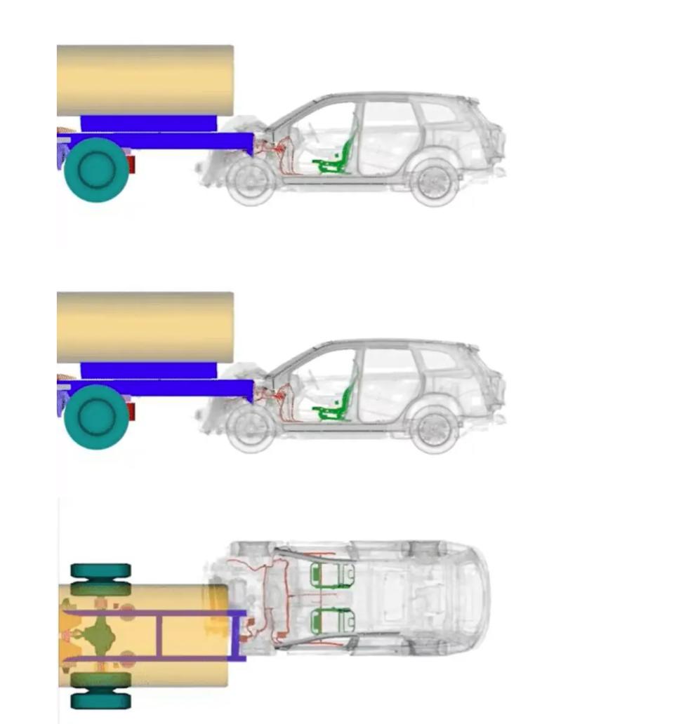 - 事故车辆与前方道路养护车发生 115km/h 高速追尾碰撞时,前方车辆尾部突出梁状坚硬结构瞬时严重侵入事故车辆左上侧前机舱及乘员舱,导致前机舱及乘员舱严重损坏,线束瞬间被切断,前机舱被高温部件或线束短路火花引燃,前机舱左侧先起火,后火势蔓延至整车,动力电池包未发生自燃。