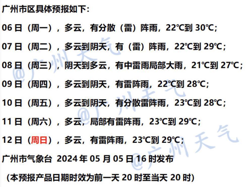 广州市气象台 5 月 5 日预计,6 日至 8 日广州以多云(雷)阵雨天气为主,间中局地雨势较大。其中 6 日广州多云有分散(雷)阵雨;7 日起广州雷雨相对活跃,8 日广州有中雷雨局部大雨;展望 9 日至 12 日广州多云到阴天,有局部或分散雷阵雨。因降水相对减弱,预计 6 日至 12 日广州市区日最高气温可维持在 27 ℃~30 ℃。