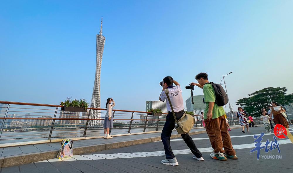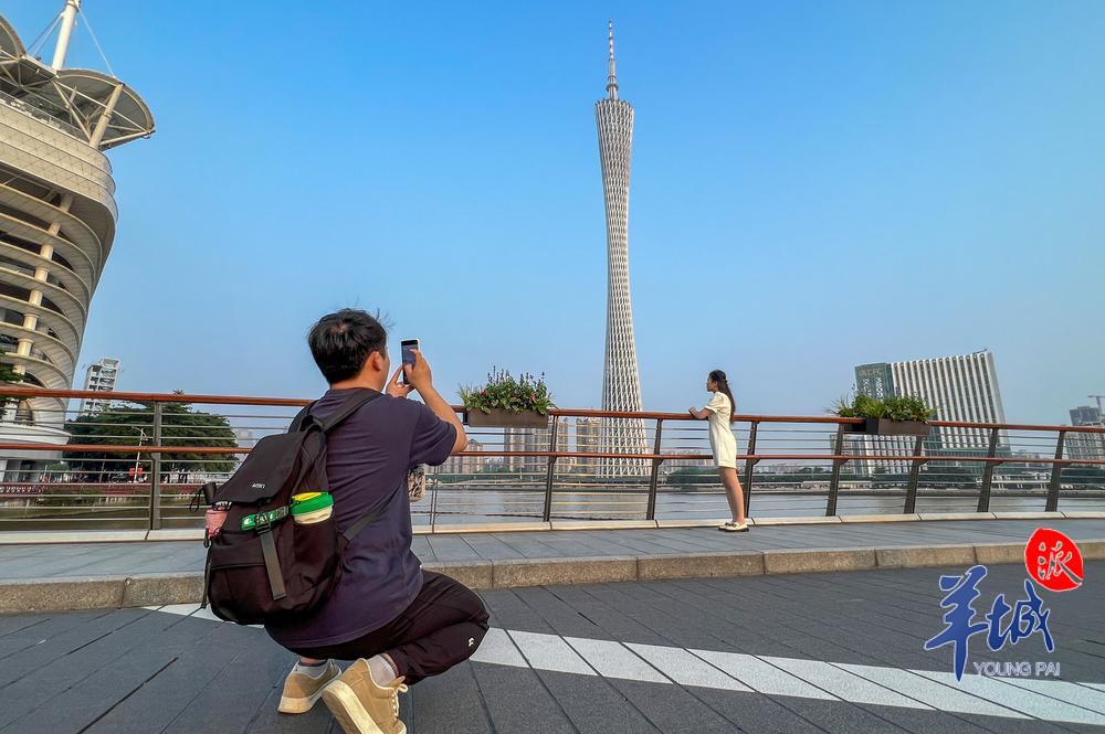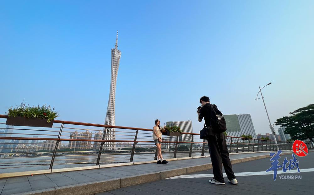 记者在广州街头看到,不少市民游客趁 " 五一 " 假期最后一天天气好转," 打卡 " 阳光和蓝天构成的 " 广州蓝 " 景象。