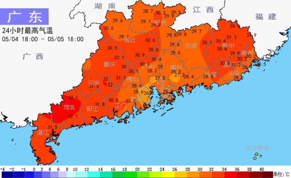在 " 五一 " 假期最后一天,持续在广东 " 劳动 " 的强降水天气终于有 " 暂时休息 " 之安排。广东省气象部门观测,5 月 5 日白天,广东大部气温因雨水暂歇及阳光重现而回升,截至 5 日 18 时多地国家基本气象站最高气温均升至 30 ℃或以上。在广州,广州国家基本气象站 5 日录得最高气温 28 ℃;市内多个非国家基本气象站点,包括从化、花都、越秀、白云、增城等地的自动气象站录得 30 ℃以上最高气温。