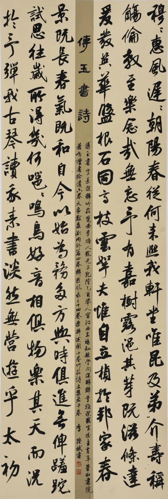 傅玉书是一位有成就的诗人,一生足迹遍及大江南北、黄河上下,壮美的河山激发了他的创作灵感,他的诗充满了幽奇、冲淡、沉雄多变的艺术风格。《竹庄诗文集》,是傅玉书青壮年时期的作品选集。时礼部侍郎钱箨石亲笔为之作序:“先生诗文,鉴赏于法时帆、钱箨石、吴白华诸先辈者,已风行海内矣。”他的诗文集刊行问世,“海内之士,几何不徒以文人相目”。“仪征阮文达公求得其遗书而善之,其必传于后世无疑。”他所著的《竹庄·四书文》、《古今诗赋文钞》,曾为当时学者卢南石、吴白华、钱箨石、所著诗文翁凤西所刊布。贵州素来诗文闻名天下,但辞赋却很不出彩,瓮安汉代有盛长通先生千里向司马相如学赋,他的故事在《西京杂录》上有记载,可惜他的辞赋却没有传下来,但激烈了 后面很大一批人 ,傅玉书就是诸体皆擅,今天我们还能看见的辞赋,时人点评颇高,在贵州仅存的赋中,水平也是佼佼者,可以讲为近些年瓮安争取“中华辞赋之乡”作出了巨大的奉献。由此,“黔南傅竹庄先生以名孝廉蜚声艺苑,所著诗文风行已久。”后来的诗人把傅玉书和瓮安县另一位诗人犹法贤称为贵州高原的两大诗宗:“竹庄诗学杜,酉樵诗学韩,黔人两大宗,皆生于瓮安”,是有一定道理的。