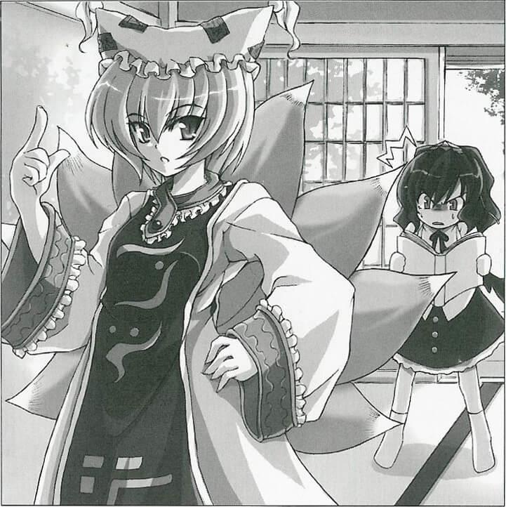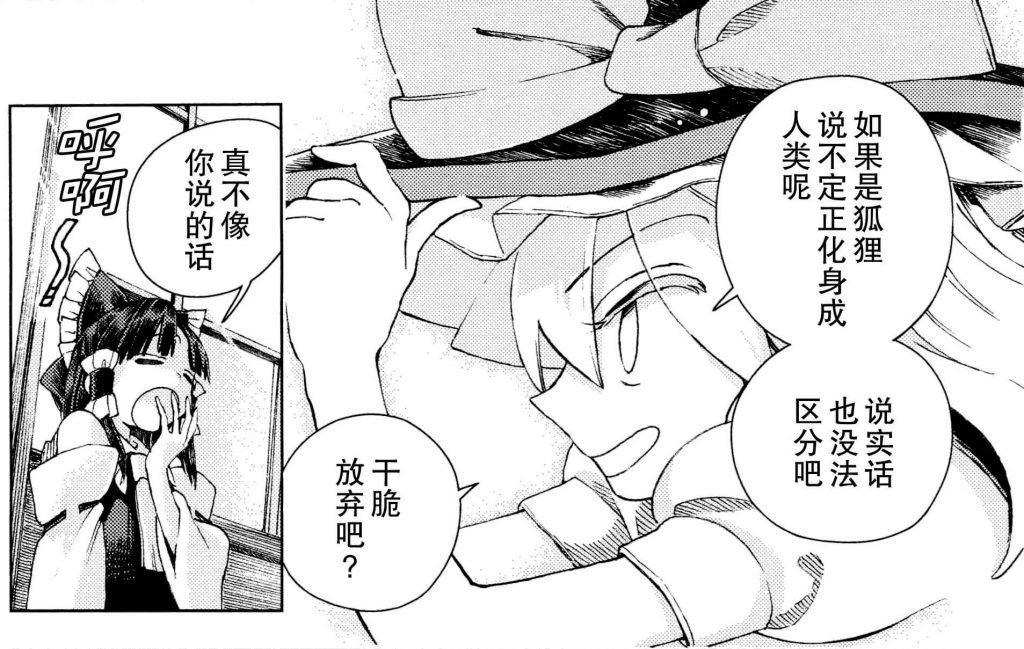 从这一幕里,就可以看出在东方的世界观中,除了狸猫之外,狐狸也是有变幻能力的,只是没有在蓝的设定上表现出来而已。不管是在《东方铃奈庵》还是《东方茨歌仙》里,都有过狐狸变成魔理沙的情节。