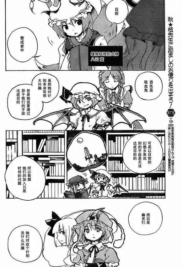 对此,阿求解释说不必担心。幻想乡是否有变化?境界是否出现了破绽?蓝只是在对这些问题进行定期的检查。这本来也是紫的工作,不过好像因为嫌麻烦,也让蓝来代替了。