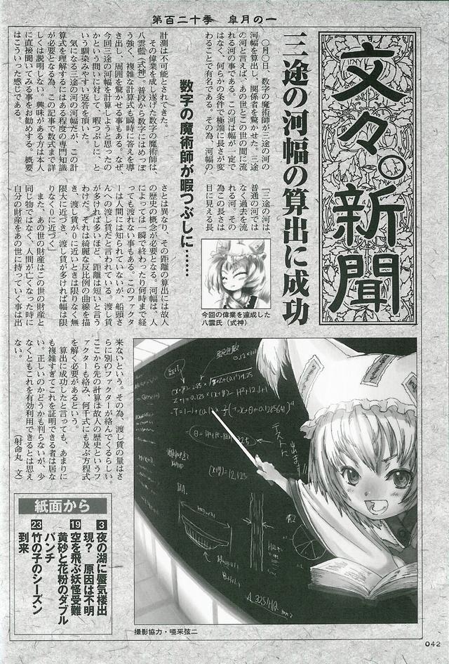 蓝对文文说,因为紫总是睡觉,所以她的时间多得快要烂掉。为了打发时间,就会自己想一些新的算式,然后作出用来解开它的式子。除了三途河的河宽计算,其他的还有诸如计算要让雾包围幻想乡的话需要多少的粒子,要到达北极星的话需要多少时间等……