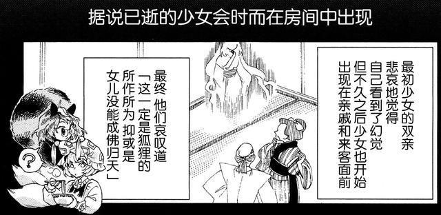 《东方铃奈庵》中,出现了谜之少女的幽灵,但她被人们当做狐狸的幻术。于是在画面左下方,出现躺着也中枪的蓝和猯藏。