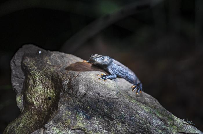 张佑祥介绍,疣螈这种物种的生态位十分脆弱,它们没有锋利的牙齿、爪子,也没有坚固的鳞片,生存下来几乎都是靠躲,躲避强大的掠食者,躲避阳光,躲避人类居住区。它们把隐藏的技能修炼到极致,白天躲在树叶或石缝中,夜晚才会到附近的水域觅食或繁殖。