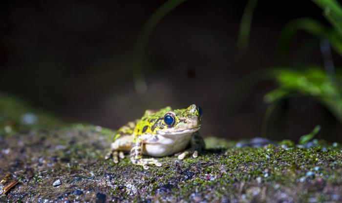 草地上趴着一只黄冈臭蛙,它们一般喜欢栖居在靠近溪流的疏林里,夜晚也被追逐光线的飞虫吸引,来到我们回程的路上。它们花绿色的皮肤可以分泌毒液,散发臭味,让捕食者不敢下口。
