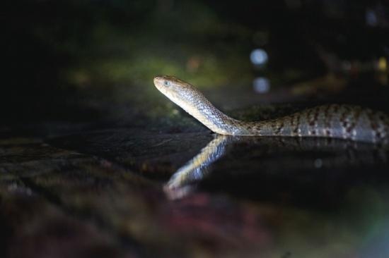 给两栖动物拍生态照也是件困难的事情。夜间黑暗,需要灯光辅助,而面前的乌华游蛇只想逃命。我们把它放在潭中游弋良久,看它已经疲惫不堪,趴在一块岩石上休憩,就把握机会,拍了几张“定妆照”。