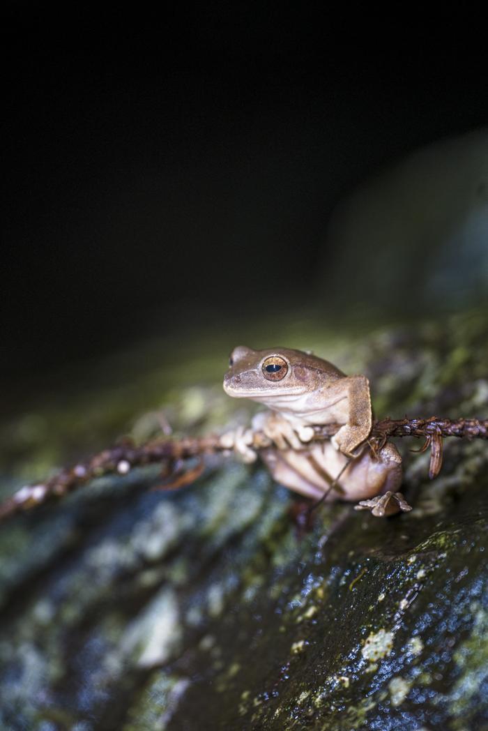 我们剥开草丛向下游走,一只大眼睛、很萌的布氏泛树蛙怀抱着一截树枝,悬挂在溪流之上,它大约可以借此捕捉空中的飞虫,有人类从身旁走过,也依然安之若素。