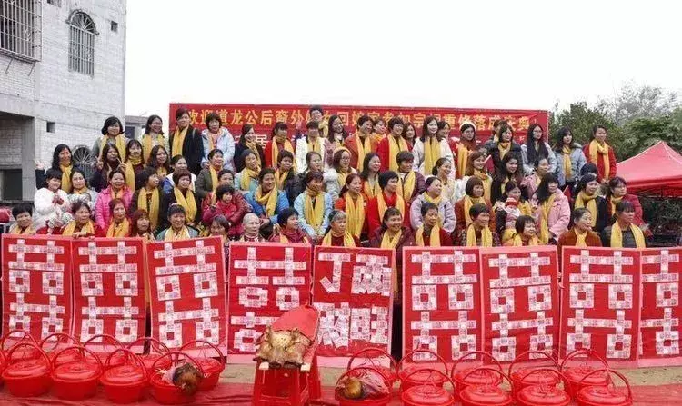 刘家女儿在大红的囍字后合影留念,丰盛的祭品寓意刘氏子孙日子红红火火!
