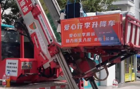 因为新生数量较多,学校虽然也组织了很多老生来当志愿者,但完全依靠志愿者人力搬运行李不太现实,于是该校后勤处决定采取低楼层用人力搬运,而 3 楼以上用升降车的办法。