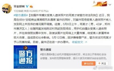 - 男子拍摄“遇害空姐”遗体照在朋友圈传播被警方刑拘 2018-05-13 08:34 | 人民日报客户端 据@平安郑州 通报:近日,郑州市公安局在侦办“空姐乘坐滴滴顺风车遇害”案件的同时,对案件...