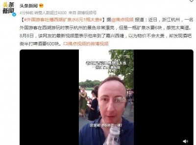 - 外国游客吐槽西湖矿泉水6元一瓶太贵:感觉太离谱 【外国游客吐槽西湖矿泉水6元1瓶太贵】据@沸点视频报道:近日,浙江杭州,一名外国游客在西湖游玩时表示杭州的景色非常漂亮,...