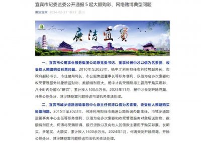 - 四川宜宾一官员醉心买彩票,9年花了1600余万 2 月 21 日晚,四川宜宾市纪委监委公开通报 5 起大额购彩(购买彩票)、网络赌博典型问题,其中宜宾市城乡道路运输事务中心原主任何涛...