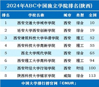 - 2024年陕西独立学院排名一览表:西安交通大学城市学院第一 2024年ABC中国独立学院排名已正式发布,共有139所独立学院上榜,其中陕西上榜8所,7所进入2024年中国独立学院百强。 本年度...