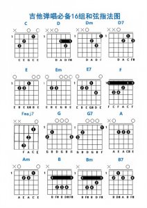 - 吉他弹唱必备16组和弦指法图 一、C调常用和弦 C、Dm、Em、Fm、G、Am、G7 二、D调常用和弦 D、Em、#Fm、G、A、Bm、A7 三、E调常用和弦 E、#Fm、#Gm、A、B、#Cm、B7 四、F调常用和弦 F、Gm、Am、♭...