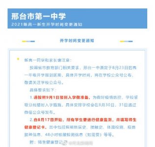 - 邢台市一中开学时间延期 8月16日,邢台市第一中学发布2021级高一新生开学时间变更通知。通知称,按照省市教育部门相关要求,邢台一中原定于8月23日的高一年级开学报到延期。请高...