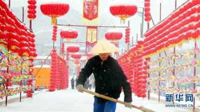 - 石家庄迎降雪 2月13日,在河北省石家庄市鹿泉区民俗大庙会上,工作人员清理积雪。当日,石家庄出现降雪天气,为整个城市增添了喜庆年味。新华社发(张秀科 摄) 2月13日在河北省...