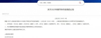 - 刚刚,沪深北交易所发布春节休市安排→ 【大河财立方消息】 1月23日,沪深北交易所发布2025年春节休市安排。 1月28日(星期二)至2月4日(星期二)休市,2月5日(星期三)起照常开...