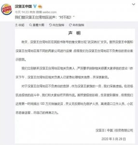 - “汉堡王中国”致歉 近日,有网友曝出台北市一家汉堡王门店在其海外社交网站上发布促销信息时使用污名化的“武漢肺炎”一词,引起众多网友的不满。 3月29日下午,汉堡王中国在...