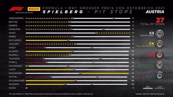 对于奔驰两站疲软的表现,赛后梅赛德斯车队的首席赛道工程师索夫林总结道:“第20圈汉密尔顿超越诺里斯排到第二时,维斯塔潘已经拉开了9秒的差距。”索夫林解释说,在奥地利站,软胎——最软的C5配方的轮胎在周六排位赛上的效果不及周五的练习赛。