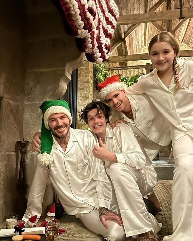 声明:文字原创,图片来自网络,如有侵权,联系删除。禁止抄袭,违者必究!小贝一家子这次过圣诞很有特色,一家人穿着同款睡衣亮相,20岁的二儿子罗密欧,17岁的三儿子克鲁兹和11岁的小七,当然了,大儿子要和老婆一家过节,所以贝克汉姆在发布圣诞合影的时候,特意在文案中提到了想念大儿子。