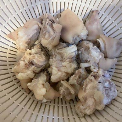 1、猪蹄冷水下锅戳一下,加入姜片,料酒,然后捞出备用