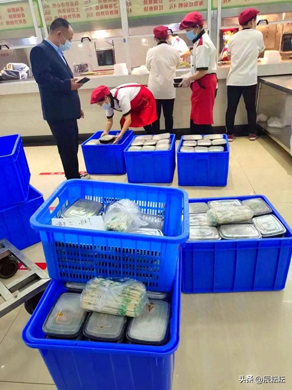香喷喷的,干净卫生安全的盒饭,装满一框框!然后分发下去。