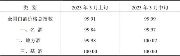 据全国白酒价格调查资料显示,2023年3月中旬全国白酒环比价格总指数为99.99,下跌0.01%。从分类指数看,名酒环比价格指数为99.97,下跌0.03%;地方酒环比价格指数为100.02,上涨0.02%;基酒环比价格指数为100.00,保持稳定。(见表1)