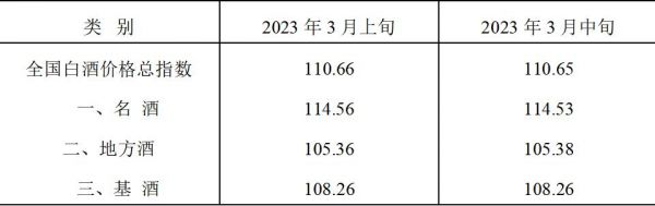 从定基价格指数看,2023年3月上旬全国白酒定基价格总指数为110.65,上涨10.65%。其中,名酒定基价格指数为114.53,上涨14.53%;地方酒定基价格指数为105.38,上涨5.38%;基酒定基价格指数为108.26,上涨8.26%。(见表2)