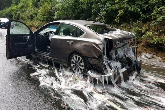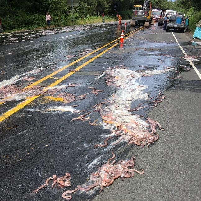 盲鳗的的黏液随之“一泻千里”,覆盖了整片公路,使得后方的车辆也难逃一劫,最终导致四车连环相撞。幸运的是,无人伤亡。