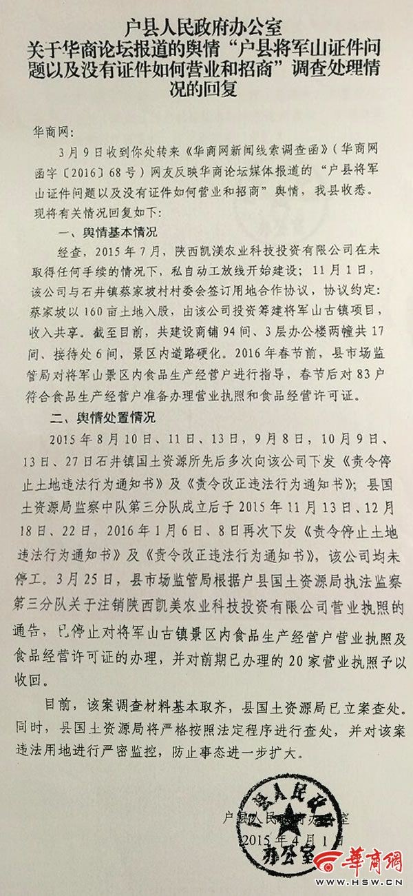 3月9日,华商网就此事致函户县人民政府办公室。4月1日,户县官方经调查给华商网来函回复:确如网友所说,将军山古镇是在未取得任何手续的情况下,私自建设的旅游景区。