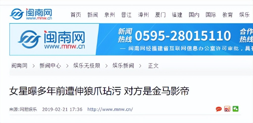 参考资料:闽南网2019年2月21日——女星曝多年前遭伸狼爪玷污 对方是金马影帝