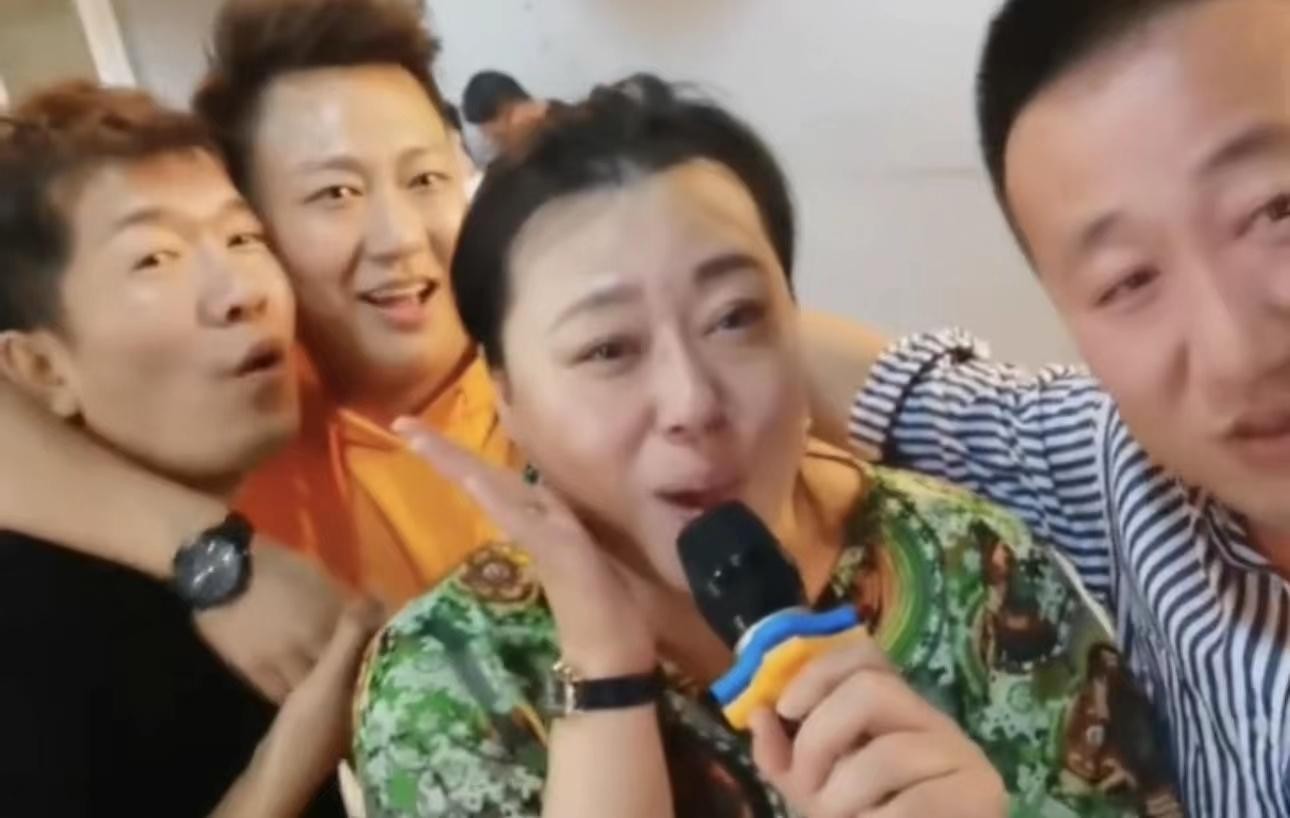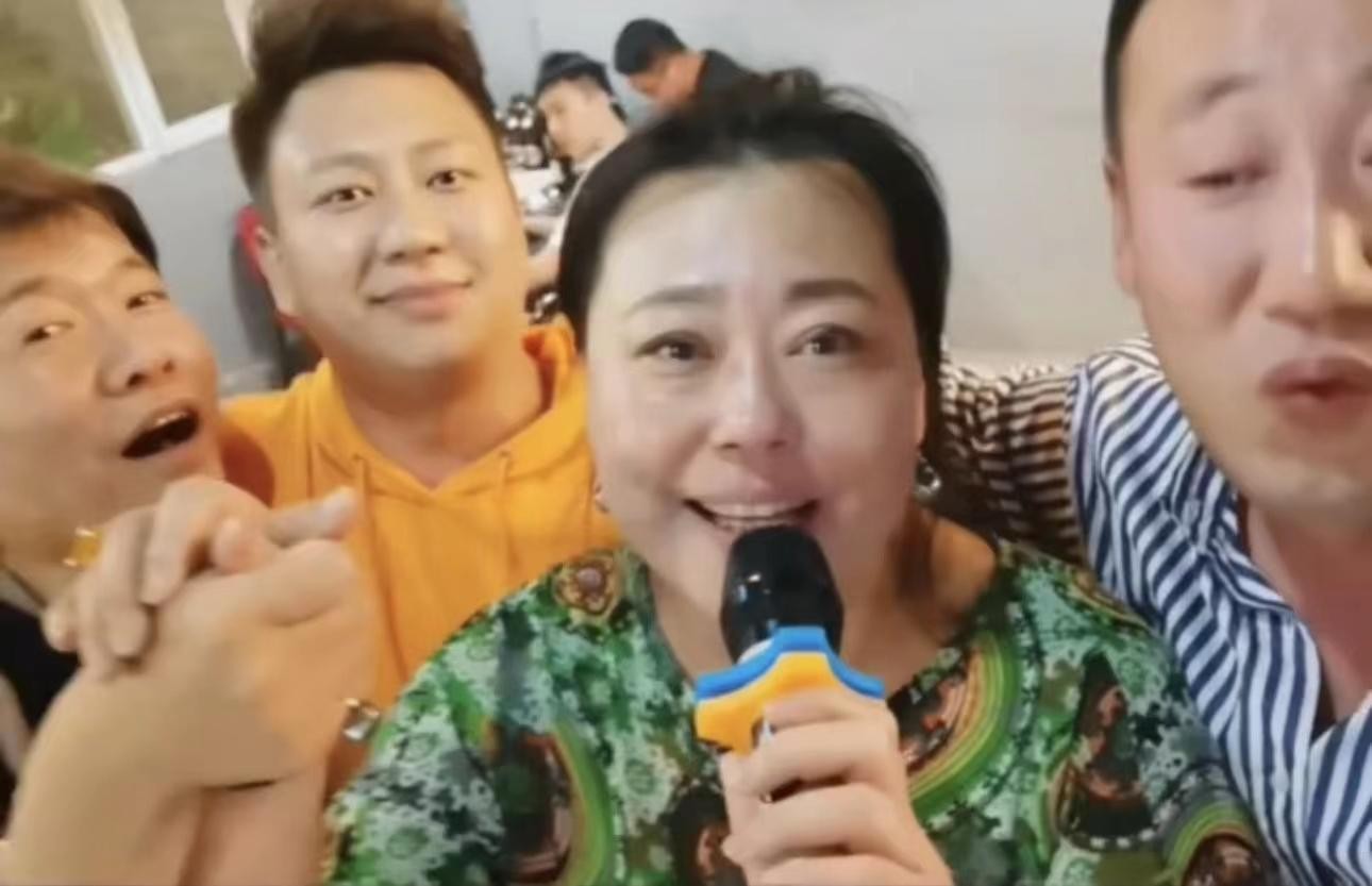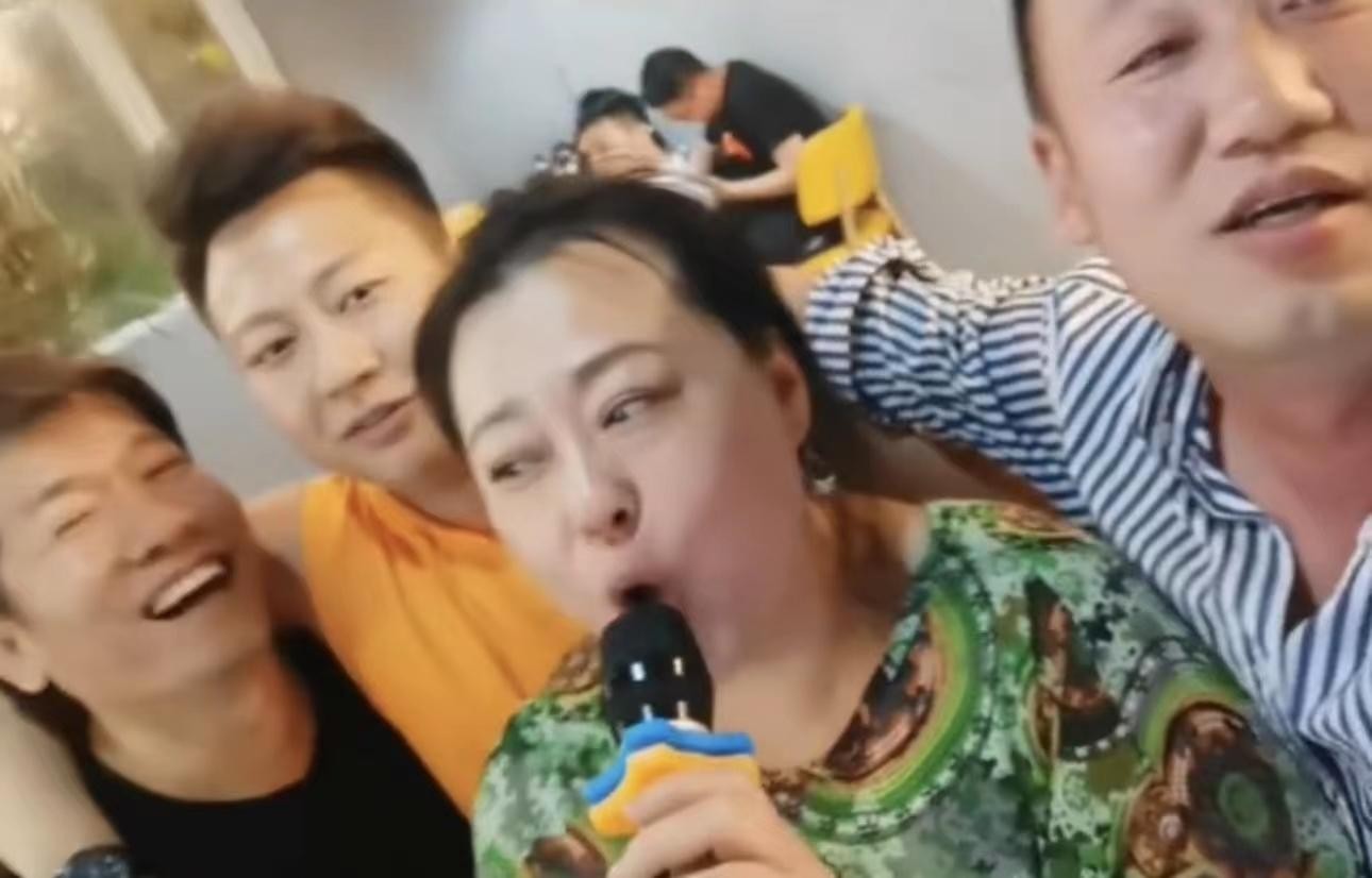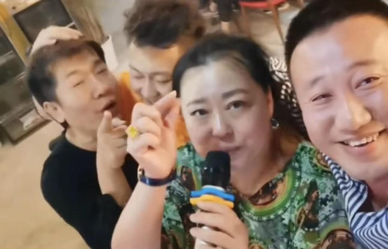 心情相当不错的她,举着话筒高声歌唱。引人注目的是,除了谭先生外,她的身后还围着2名男子。