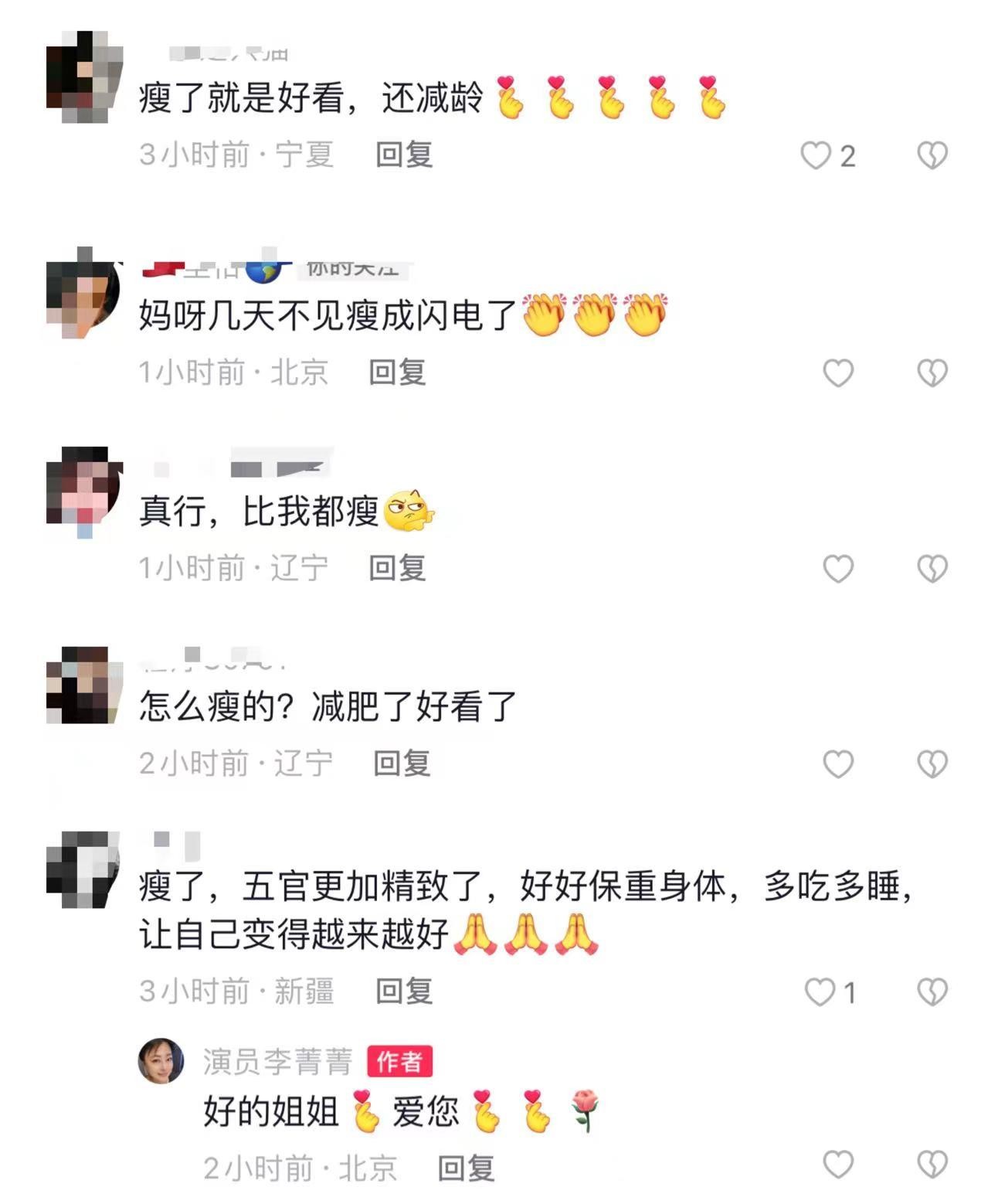 视频曝光后,网友们也惊叹不已,纷纷夸赞李菁菁瘦成了一道闪电,五官变得越来越精致。此外,还有不少人询问李菁菁的瘦身秘籍。