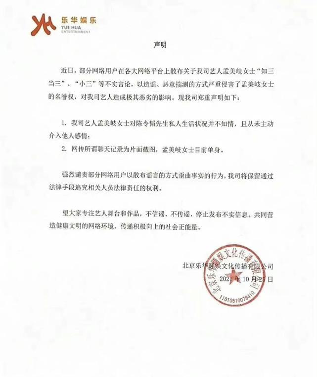 作为事件的另一个主角孟美岐,其所在公司乐华业回应了此事,否认孟美岐主动介入他人感情,目前是单身,表示聊天截图很片面,也就是承认陈令稻前女友截图内容属实。