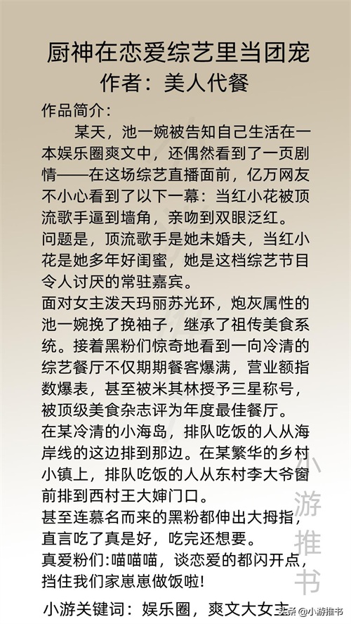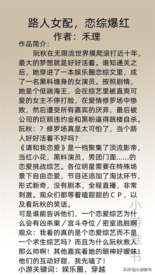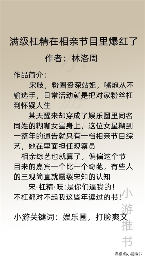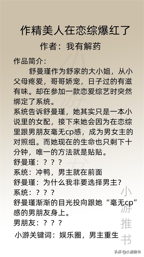 大家好,我是@小游推书,今日份推出的是娱乐圈恋综搞笑现言小说,女主或是穿越,重生,穿书系统等背景,参加恋综,逆袭原人设,女主也是人间清醒,不断给观众带来意想不到的反差萌,直接弯道超车爆红了。刺激又搞笑,文荒必入。#网文##小说##推文##言情#