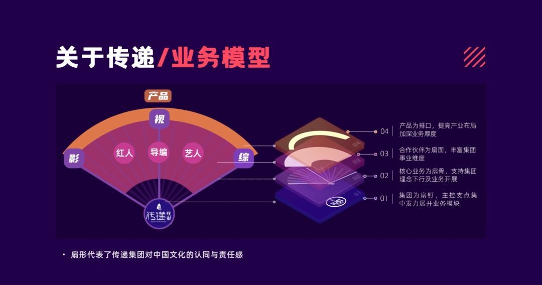 作为港股上市公司,传递娱乐以影视综内容创制作为主要商业价值赋能,业务涉及电影、电视剧及综艺节目的制作与发行,艺人、红人经纪等多个维度。去年年初,传递娱乐从最初的“金字塔阶段”转向扇形业务模型——以传递娱乐集团为扇钉主控,影视综核心业务线为扇骨,包括导演、编剧、艺人在内的人才和合作伙伴为扇面。