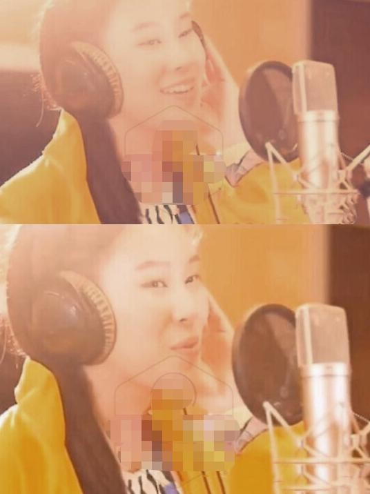 照片中的杨海润长发披肩,戴着专业耳麦站在录音室里唱歌,表情很放松,看起来很享受录歌的过程。