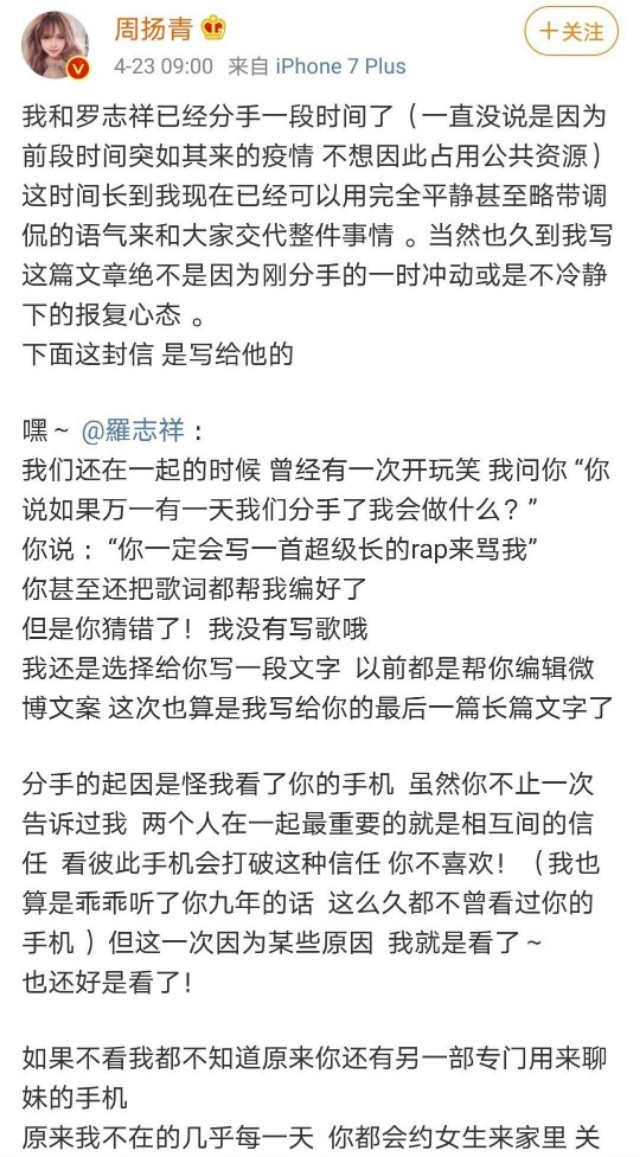 前天又有爆料称有艺人被拍到恋情,众人猜测纷纷,昨天早上起来一看,原来是彭昱畅(彭昱畅是早上九点四十九发的微博承认恋情,而周是在上午九点发的微博,所以不排除彭昱畅是被拉出来想转移大众视线,降低周扬青曝光的热度的,但是好像很明显,大众更加关心罗志祥和周扬青,彭彭恋爱这个瓜起不到转移热度的作用),本以为彭彭公布恋情肯定会预订热搜一位,万万没想到上午九点的时候罗志祥女友啊不对应该是前女友周扬青发了一篇微博,是写给罗志祥的信,可以说是声明类型的范本了,生动形象,起承转合巧妙,引人入胜虽然是一篇声明,但是又不像一篇普通声明一样刻板无趣,先是写的和小猪的回忆,又从回忆拉回现实,以一种平静但却透露出绝望的语气接揭露了与猪分手的原因——每到一个城市就有女生做伴、长期跟公司女艺人和化妆师保持不正当关系、进行“多人运动”,让她感觉不能接受,本来打算好聚好散但是为了防止更多女生被他欺骗,她决定曝光罗志祥。