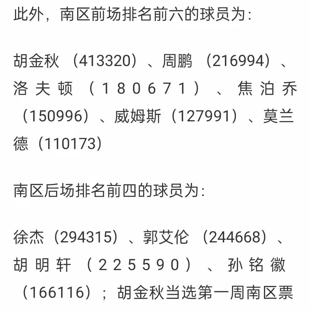 - 南区 胡金秋以413,320票位居南区前场第一,当选南区票王,实至名归。周鹏以216,994票位居南区前场第二,争议较大。洛夫顿以180,671票位居南区前场第三,实至名归。