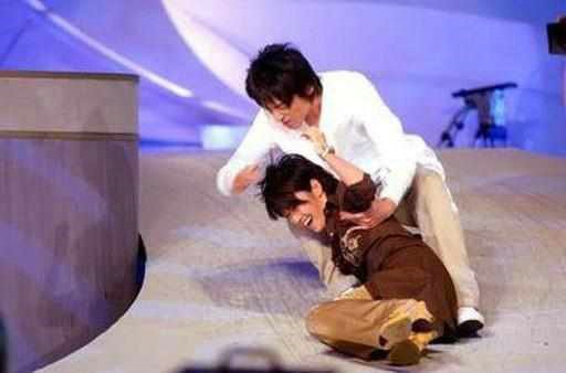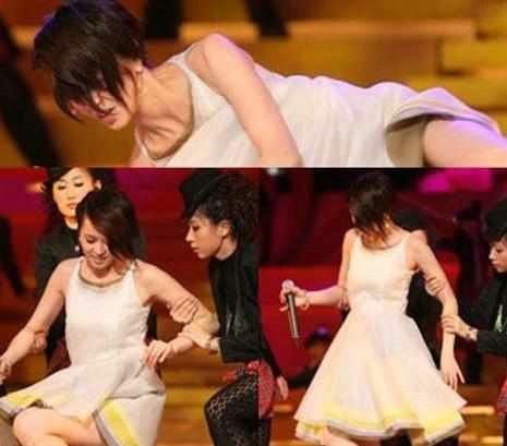梁咏琪不小心捡到了舞蹈演员身上掉下来的塑料珠子,失去平衡而摔倒,但是她很快就爬起来,忍痛继续把歌唱完。