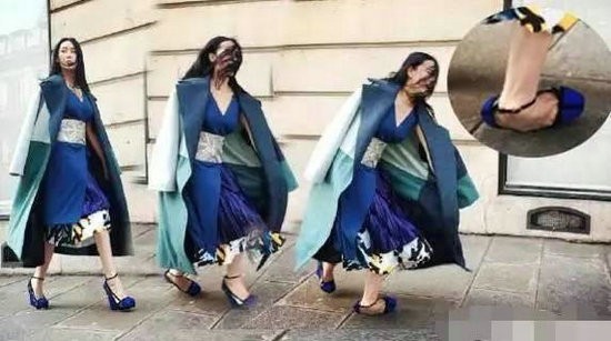 张馨予在拍巴黎时尚街拍时,不小心高跟鞋崴了一下,这镜头拉近一看真是为张馨予捏一把汗,脚踝已经完全扭曲,这个程度还能好好走路吗?