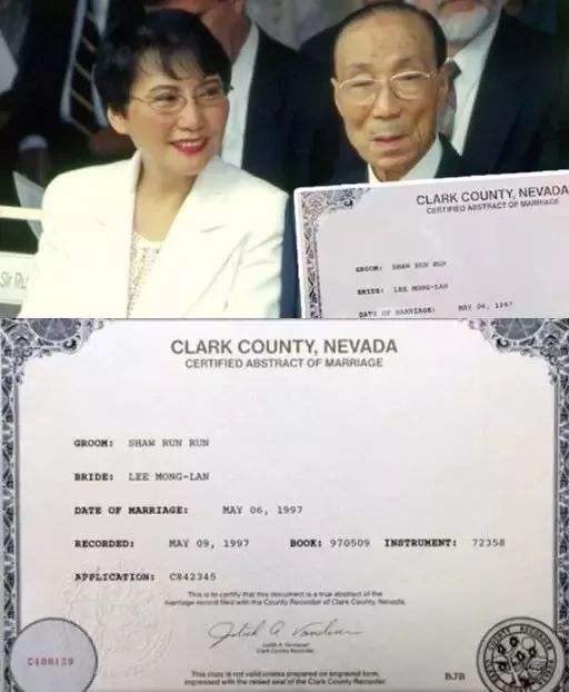 1997年,在美国拉斯维加斯迎娶方逸华,时年90岁,方逸华62岁。